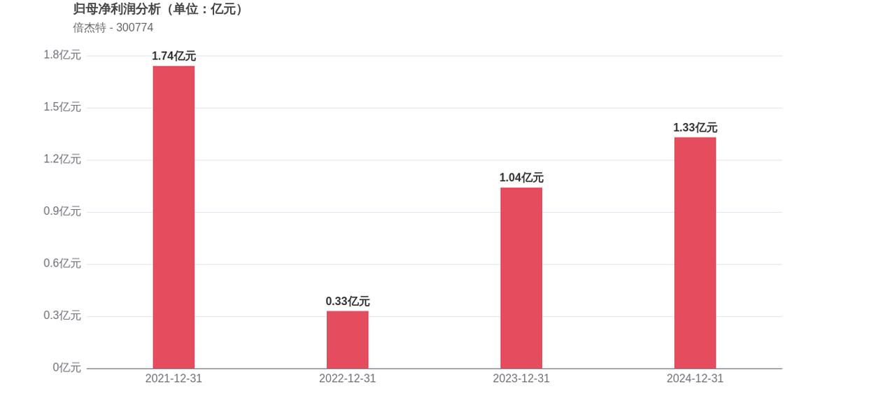 倍杰特上市的2021年,当年实现归母净利润1.74亿元。截至最新完整财年的2024年,公司实现1.33亿元的归母净利润,近年累计下降了23.59%。这4年间,倍杰特无一年份出现亏损。