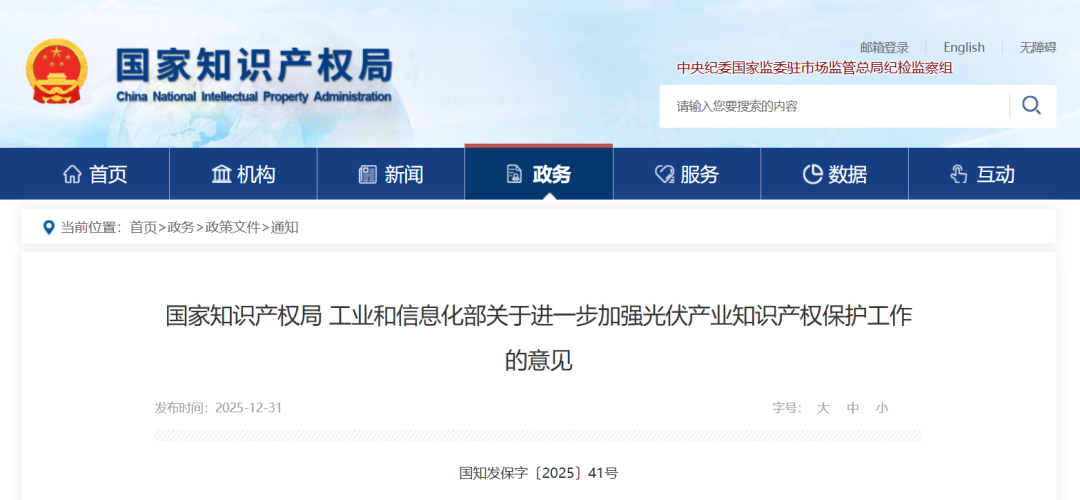 知识产权保护问题是光伏行业“内卷式”竞争的核心症结之一。2025年12月31日,国家知识产权局、工业和信息化部联合发布《关于进一步加强光伏产业知识产权保护工作的意见》,要求充分发挥知识产权保护和激励创新的价值功能,有效破解“内卷式”竞争,持续营造公平有序的市场环境,促进光伏产业健康发展。其中特别强调,要加强知识产权协同保护,“依法禁止侵犯知识产权的光伏产品进出口”;强化招投标中的侵权规制,“中央企业和国有企业要发挥好模范带头作用,坚决杜绝制售、使用侵犯知识产权商品的行为,鼓励在招标文件中明确要求投标企业自主承诺相关产品不存在知识产权违法侵权情形”。