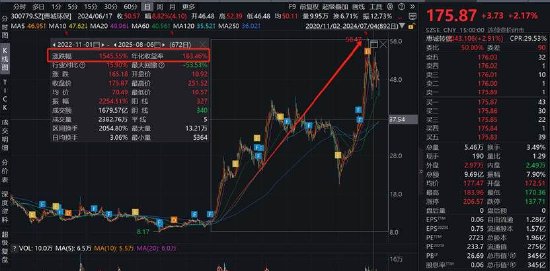 公司自2022年后股价开启走强,从低点启动至高峰,期间股价涨幅超20倍。截止8月6日,公司股价为175元/股,自2022年11月至今涨幅也超15倍。