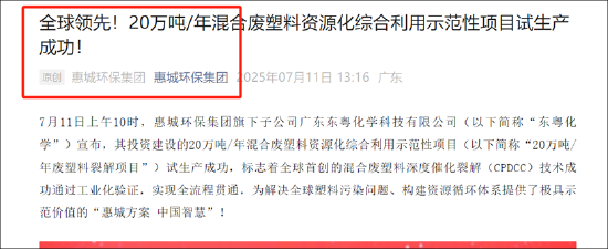 第二个时点,或不得不提惠城环保集团旗下子公司广东东粤化学科技有限公司(以下简称“东粤化学”)承建的20万吨/年混合废塑料资源化综合利用示范项目。