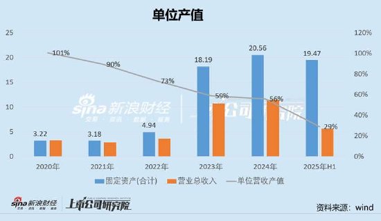 随着固定资产释放,公司的营收也随着膨胀。然而,从单位产值看,单位固定资产营收产出值近年却呈现出急剧下滑态势,固定资产由2020年的3.22亿元飙涨至2024年的20.56亿元,单位产值却由2020年的1.01下降至2024年的0.56。