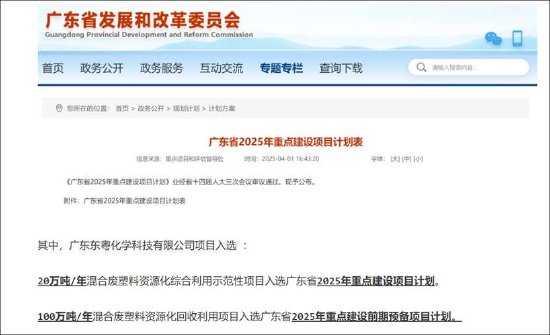2025年1月3,东粤化学20万吨/年混合废塑料资源化综合利用示范项目中交仪式在揭阳大南海工业园区隆重举行,标志着项目工程建设全面完成,顺利进入生产开工阶段。4月8日,广东省揭阳市大南海石化工业区20万吨/年混合废塑料资源化综合利用项目成功点火,据媒体宣传称其标志着全球废塑料化学回收领域迎来重大技术突破。