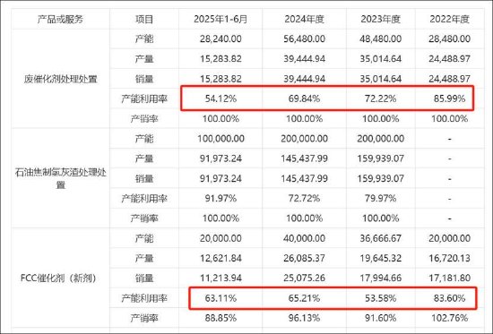 2022年,公司废催化剂处理处置产能利用率分别为85.99%,FCC催化剂(新剂)产能利用率分别为83.60%,处于较高水平。2023年至2024年及2025年上年年,废催化剂处理处置产能利用率持续走低;FCC催化剂(新剂)产能利用率整体程序触底有所反弹,但产能利用率却仅为63.11%。