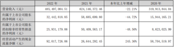 2022年年度报告显示,报告期内,公司实现营业收入4.85亿元,同比减少22.21%;实现归属于上市公司股东的净利润3244.28万元,同比减少44.72%;实现归属于上市公司股东的扣除非经常性损益的净利润2593.12万元,同比减少48.56%;经营活动产生的现金流量净额为9201.77万元,同比增长245.36%。