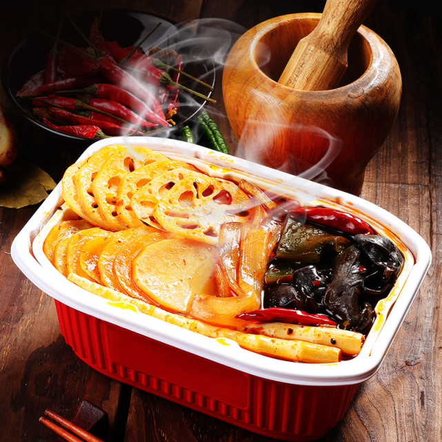 近年来,在直播的风潮下,便利、个性化的自热火锅深受消费者青睐。自热火锅的配置常简单。一般分为三部分,顶层是带有出气孔的盖子,揭盖后,位于上层的是放底料和食材的内盒,而下层则是放发热包的外盒。