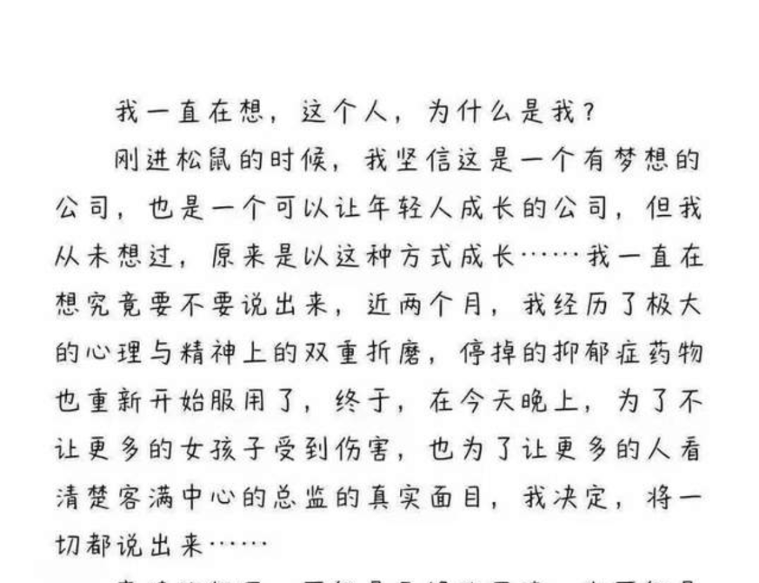有网友发文爆料称,自己遭到了三只松鼠客满中心总监szy的猥亵,现在靠自伤来缓解。