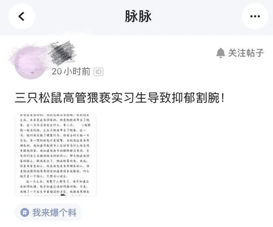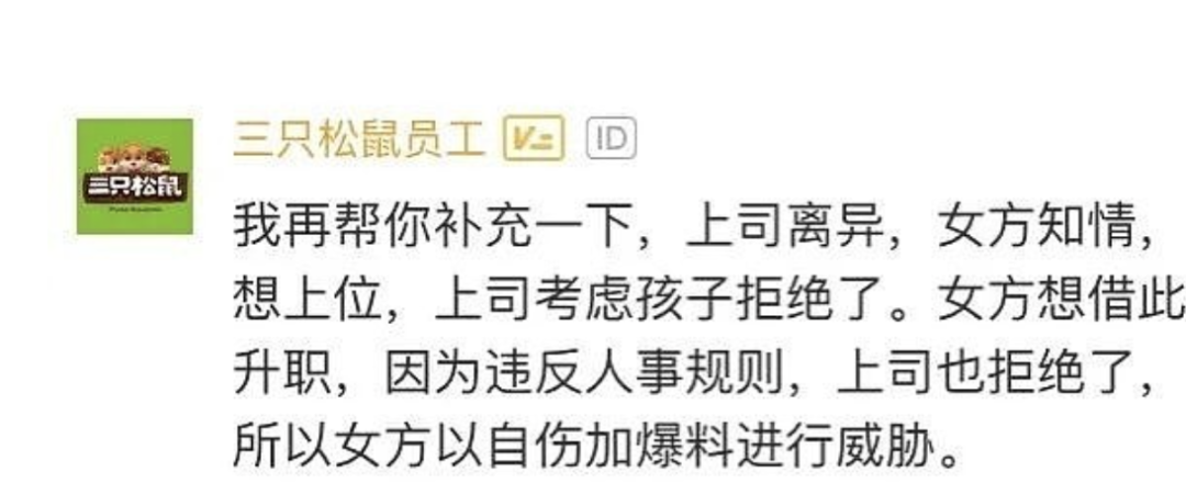 在职场社交网站脉脉,有认证信息为三只松鼠员工的网友爆料称:上司离异,女方知情,想上位,上司考虑孩子拒绝了。女方想借此升职,因为违反人事规则,上司也拒绝了,所以女方以自伤加爆料进行威胁。