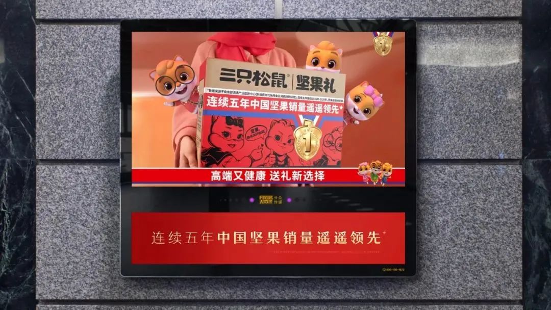 在三大增长曲线之上,三只松鼠也开始配合优化营销路径。除了减少线上渠道的低效推广外,三只松鼠最明显的动作,便是重磅投放线下的分众梯媒,开始打起了品牌广告。从侧重流量ROI到与大众主流人群展开沟通、积累品牌势能,三只松鼠在流量见顶之时审时度势的及时调整,可谓是十分明智之举。