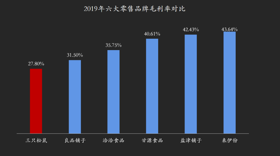 从2019年6家零食品牌毛利率水平进行对比,三只松鼠的毛利润在同行之中属于垫底。若对6家上市坚果类公司加权平均毛利率,则三只松鼠的毛利率要低于行业水平9%。