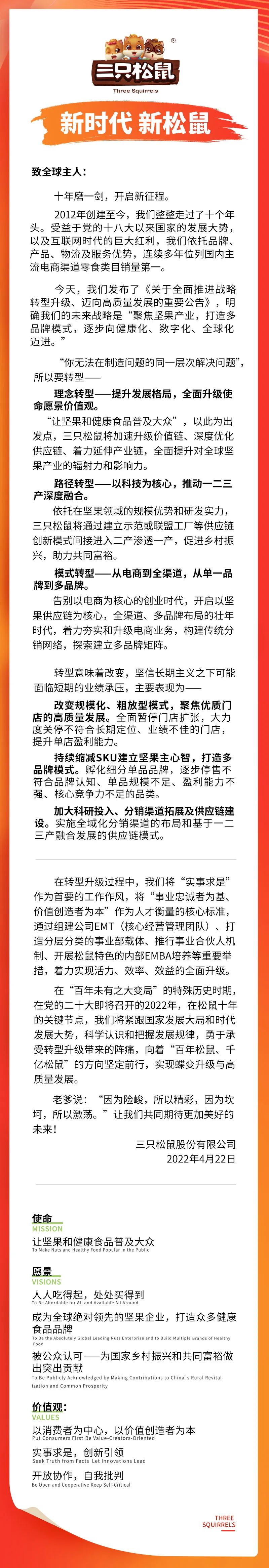 22日晚间,休闲零食领军企业三只松鼠,在披露2021年度报告的同时,发布《关于全面推进战略转型升级、迈向高质量发展的重要公告》,将公司未来十年的发展方向主动公之于众。