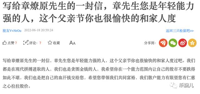 还有股民给三只松鼠创始人章燎原写了一封信,信里提到,“希望你能在一个能力范围内让自己的股市不要跌得如此不堪,我们也是把自己的血汗钱交给您,希望您能带领我们共同富裕,我们散户能力有限望您仁慈之心拉拉股价。”