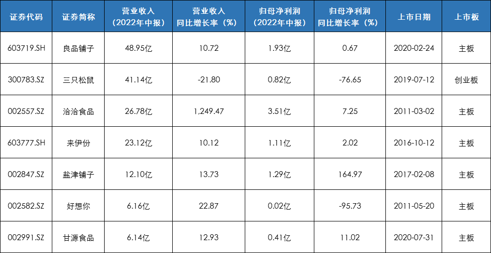 目前,有7家专注于休闲零食的A股上市公司比较具有代表性,分别是三只松鼠、良品铺子、洽洽食品、来伊份、盐津铺子、好想你、甘源食品。