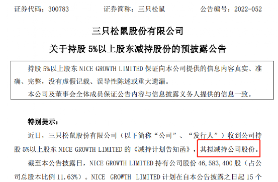 根据三只松鼠公告,截至12月11日,NICEGROWTH LIMITED持有公司股份4658万股,占公司总股本比例11.63%。此次NICE GROWTH LIMITED计划在自公告披露之日起15个交易日后的6个月内通过集中竞价交易或在自本公告披露之日起3个交易日后的6个月内通过大宗交易等深圳证券交易所认可的合法方式减持公司股份合计不超过2403万股,即不超过公司总股本的6%。