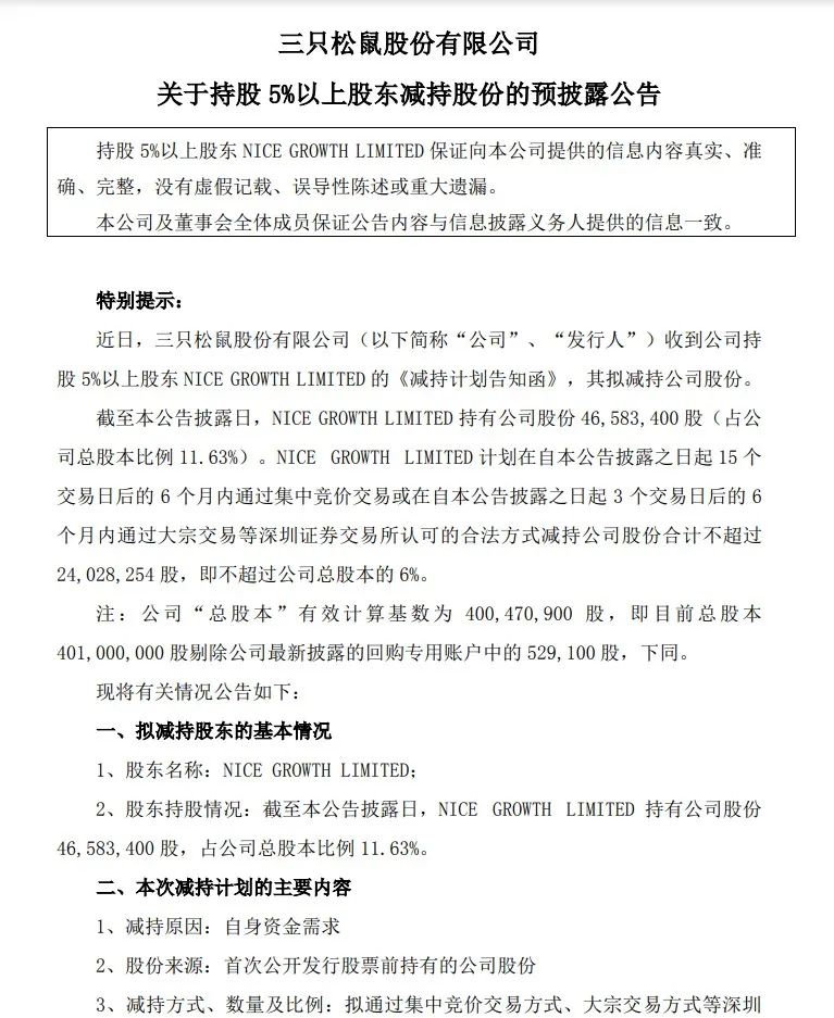 据公告披露,其持股5%以上的股东NICE GROWTH LIMITED,拟在未来六个月减持不超过6%的三只松鼠股份。
