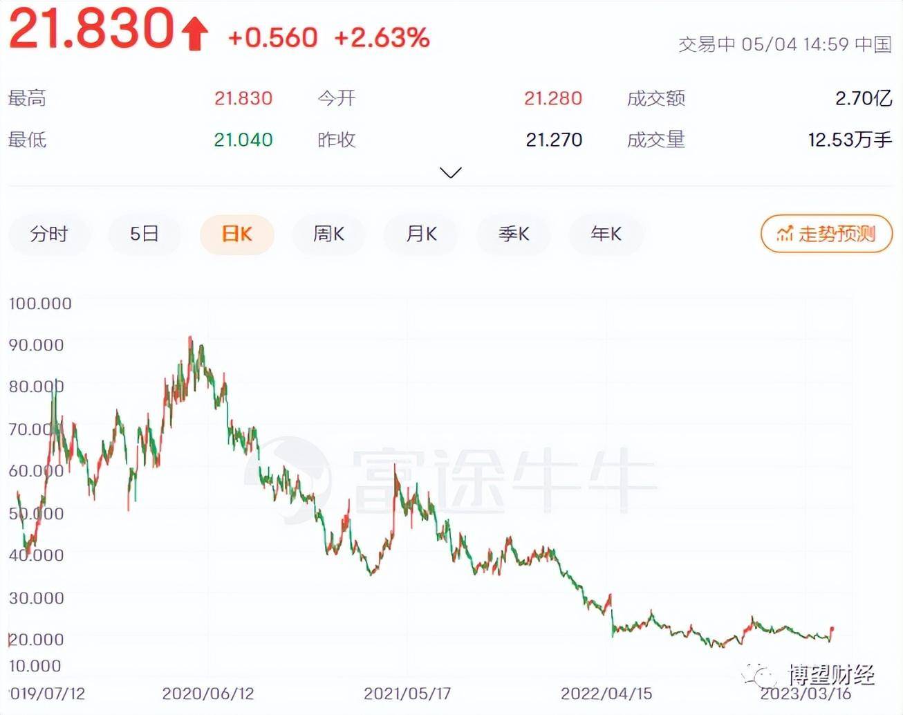 从市值来看,自2020年下半年以来股价跌跌不休,频遭IDG资本和今日资本的减持,叠加业绩表现糟糕,股价从2020年5月的最高价89.96元/股暴跌至目前的21.83元/股,市值“蒸发”超270亿元,目前仅87亿元。