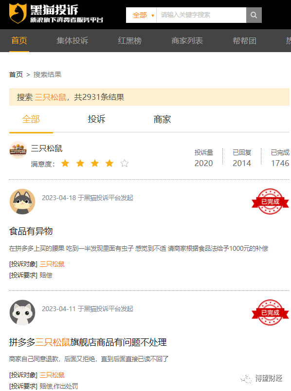 据黑猫投诉平台显示,截至目前三只松鼠的投诉量累计高达2000多条,光近30日的投诉量就有近20条,吃出异物、食品发霉、变质等成为“重灾区”。