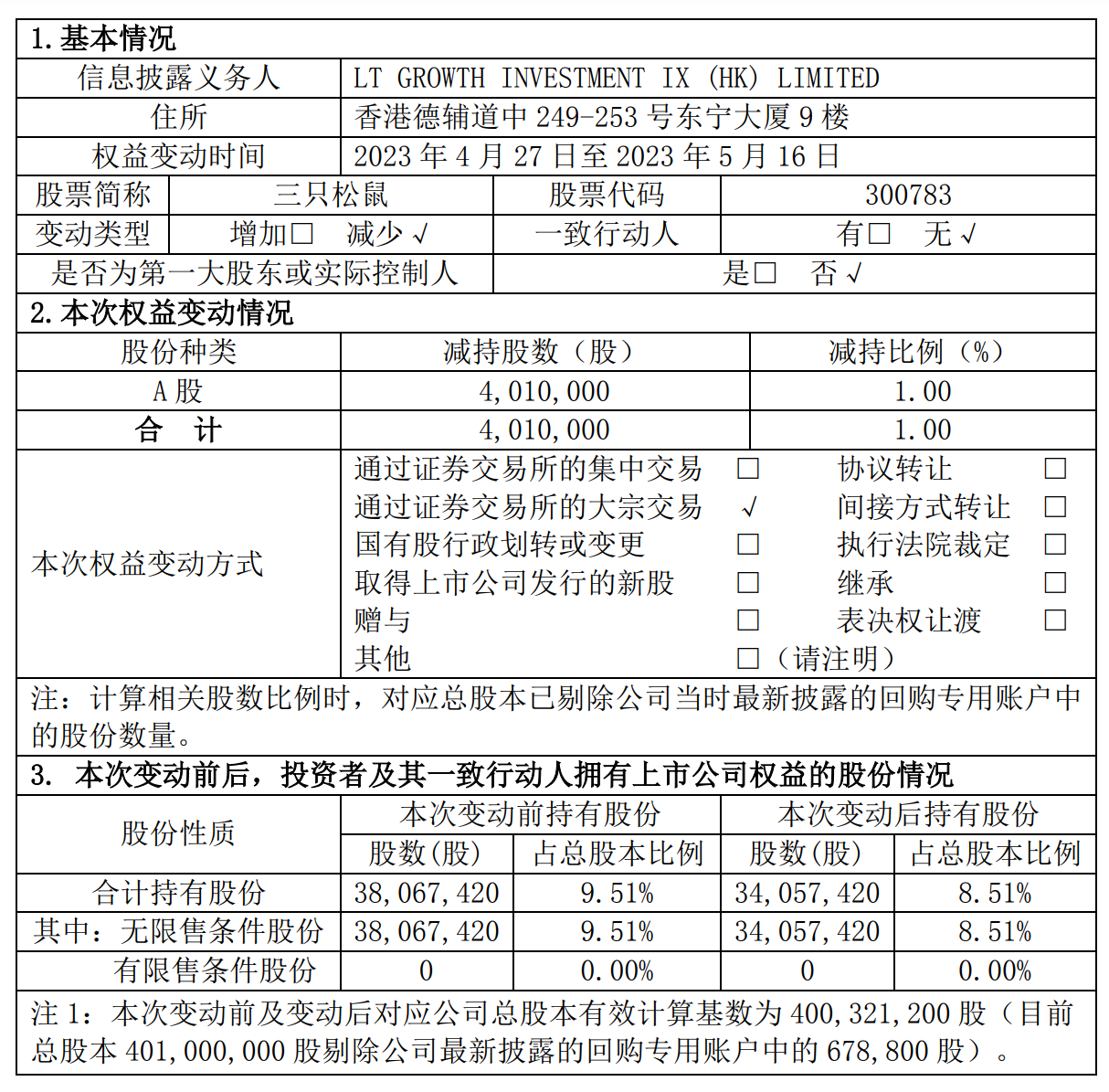 公告显示,2023年4月27日至2023年5月16日,LTGROWTH INVESTMENT IX(HK)LIMITED以大宗交易方式减持三只松鼠股份401万股,占公司总股本的1%;本次减持与减持计划公告一致。