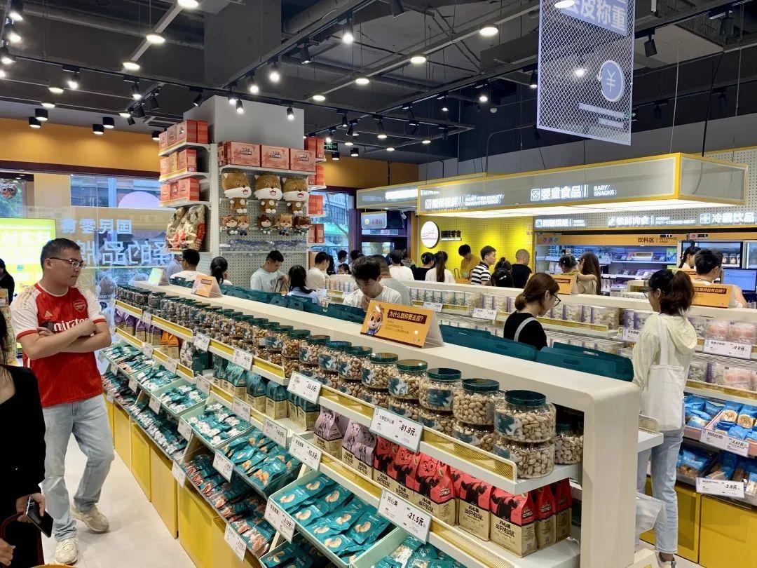 其中,位于安徽芜湖的首店面积约为200平方米,相对较大,除了零食区之外,店内还设置了婴童产品小鹿蓝蓝专区、互动休闲区等体验区。店内SKU数量超过400款,包括坚果果干、面包烘焙、肉食卤味等。