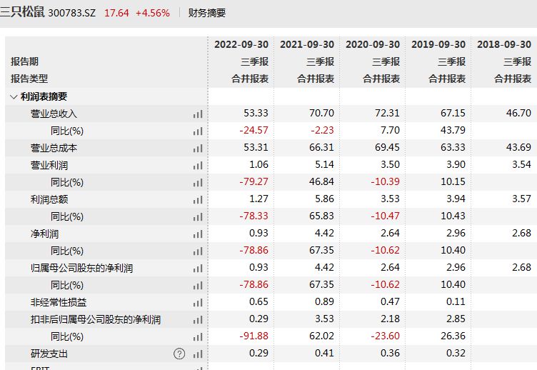 财务数据显示,三只松鼠连续三年前三季度营收同比下降。其中,2021年前三季度下降2.23%,2022年前三季度下降24.57%。