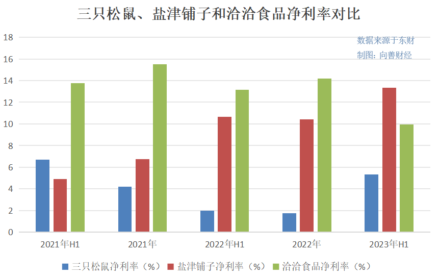 而且如果把时间线拉长来看,从2021年H1到今年上半年,三只松鼠的毛利率、净利率分别为31.13%、29.38%、27.86%、26.74%、24.97%;6.69%、4.21%、2%、1.77%、5.31%,整体低于同期,良品铺子、盐津铺子和洽洽食品们的盈利能力表现。