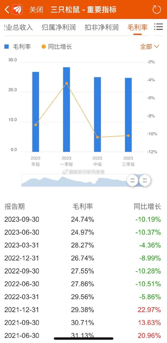 三只松鼠还在推进高端性价比战略,意图逐渐形成“全品类+全渠道”的全新基本盘,更好更快的接近消费者需求。高端性价比背后,三只松鼠的毛利率正在下滑。数据显示,今年前三季度公司销售毛利率进一步下降至24.74%,同比去年下降10.19%。