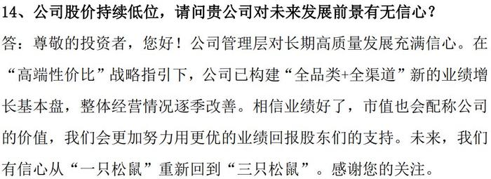 10月27日的业绩会上,三只松鼠在回答现场关于股价持续低位的问题时保证了:有信心从“一只松鼠”重新回到“三只松鼠”。