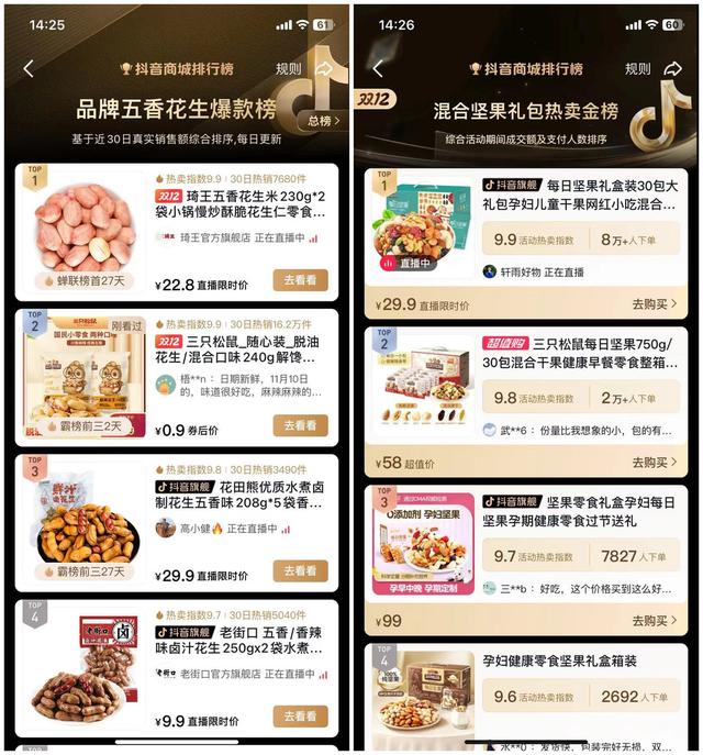 更深层来看,抖音零食类目本质上就是卷价格,这点从五香花生、坚果礼包榜单排名靠前的商品侧面也能证实。低价背后,却是高投流成本、高达人推广佣金、高退款率。