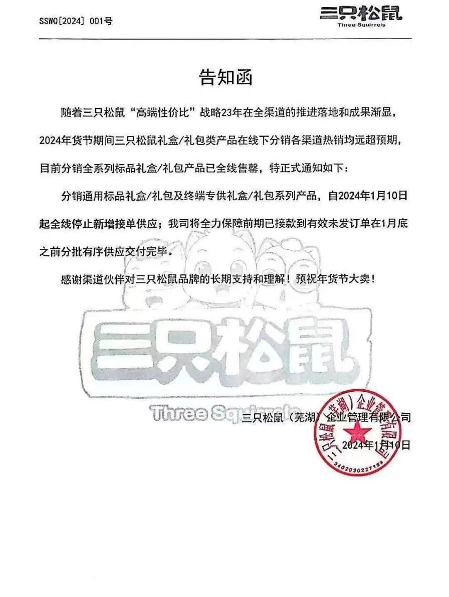1月10日午间,一份三只松鼠(芜湖)企业管理有限公司落款的《告知函》在网络流传。《告知函》显示,“2024年货节期间三只松鼠礼盒/礼包类产品在线下分销各渠道热销均远超预期,目前分销全系列标品礼盒/礼包产品已全线售罄”。据企查查数据,该公司系三只松鼠全资子公司。