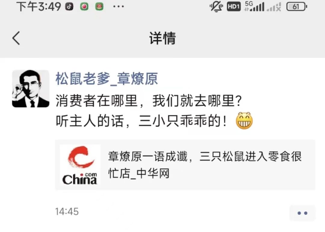 就在刚刚,三只松鼠掌门人章燎原在朋友圈转发了相关报道,并给予正面确认,称“消费者在哪里,我们就去哪里。听主人的话,三小只乖乖的”。