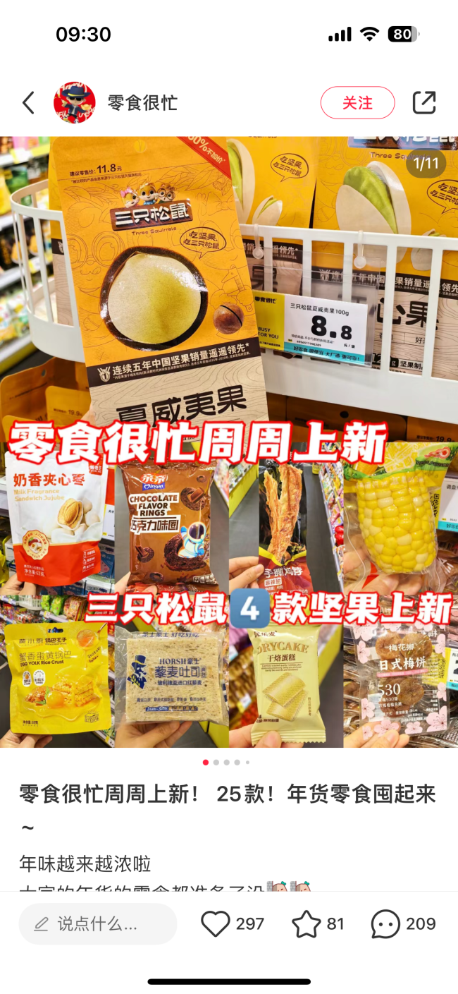 根据零食很忙小红书账号显示,一周上新20多款零食,零食很忙全国门店上新了三只松鼠开心果、手剥巴旦木、夏威夷果、碧根果等四款坚果产品。这意味着,三只松鼠以零售商的身份和零食很忙存在竞争关系,同时又会以制造商的身份和零食很忙展开合作。