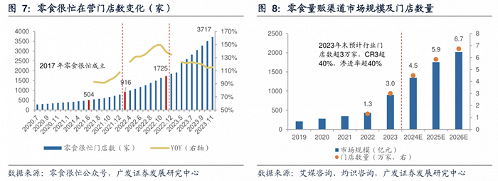 另一方面,零食销售渠道也由分散化的店铺向更为集中的零食集合店等创新模式发展。在新零售、新商业、新消费等概念的加持下,很多新兴玩家相继涌入零食赛道,如零食很忙、赵一鸣零食等地域龙头用不同于传统零食巨头的玩家的打法,在巨额资本加持下不断渗透这个万亿市场。