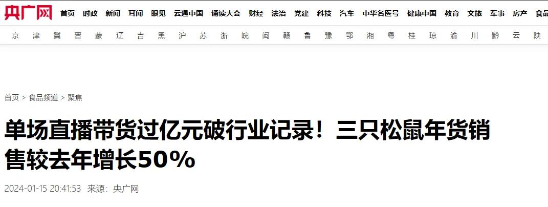 2022年时,三只松鼠的传统商超渠道推进过程中并不顺利。三只松鼠最开始的爆火得益于淘宝,2017年之前线上营收占比更是高达95%以上,其中光阿里巴巴旗下的占比就超过64%。在拼多多崛起之后,三只松鼠的原有渠道受到了冲击,所以逐渐改变渠道策略。公司在经历了业绩连续三年下滑的阵痛期之后,直到在2023年dy渠道有了重大突破。仅今年的1月11日,三只松鼠在贾乃亮直播间销售额破1.1亿,成为dy年货节首个且唯一破亿场次。