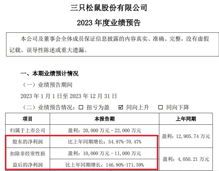 根据不久前披露的2023年业绩预告显示,三只松鼠去年净利润在2亿元以上,同比增长超50%;扣非后净利润在一亿以上,同比增长超过150%。