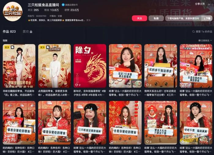 与此同时,三只松鼠还加快了在抖音平台的布局。据了解,2023年度,三只松鼠抖音渠道营收12.04亿,同比增长118.51%,其中下半年度营收7.68亿,同比增长超260%。