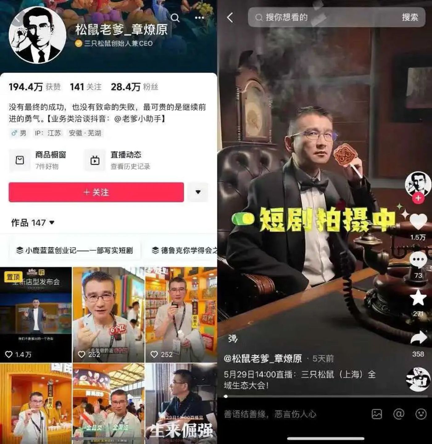 一方面是抖音的高增速,一方面是流量价格高企,三只松鼠正在推动创始人兼CEO章燎原“松鼠老爹”账号的网红化,近日,章燎原多条视频透露个人在参演多部短剧内容,试图赶上这阵短剧的热潮,为三只松鼠带来新流量。