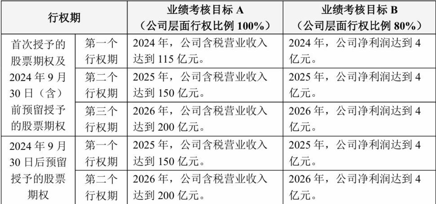考核分两个目标完成,目标A为2024年含税营收达到115亿,2025年达150亿,2026年达200亿,考核目标B为净利润4亿元。其中若达成营收目标A则100%解锁,若未达成目标A但达成利润目标B则解锁80%。