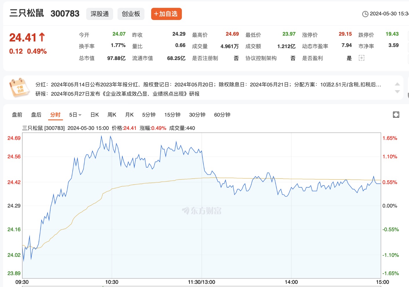 截至5月30日收盘,三只松鼠的股价为24.41元。两月内涨了超过60%,但较最高点跌超70%。