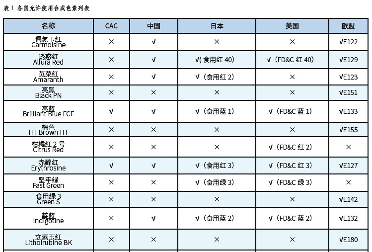 截至目前,日本允许使用的合成色素只有11种,美国允许使用的合成色素仅剩下9种,我国台湾地区允许使用的合成色素只有8种。瑞典、芬兰、挪威、印度、丹麦、法国等早已禁止使用偶氮类色素,其中挪威等一些国家还完全禁止使用任何化学合成色素。