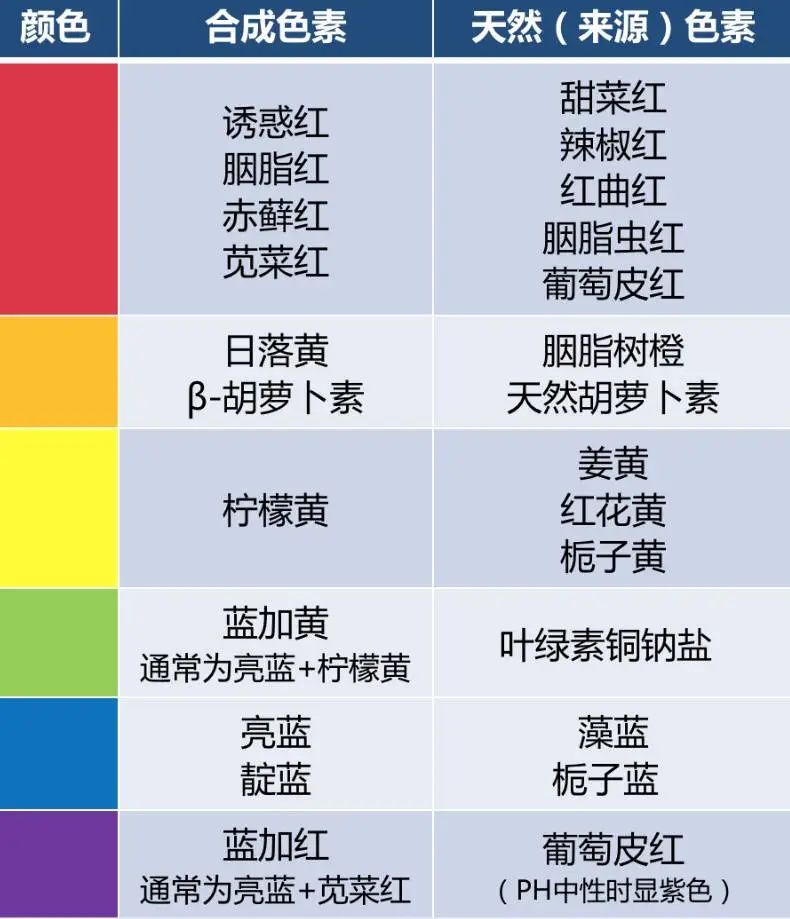 按照我国的习惯,食用色素黄色2号为柠檬黄,黄色5号则为日落黄。红色2号为苋菜红,蓝色1号为亮蓝FCF。