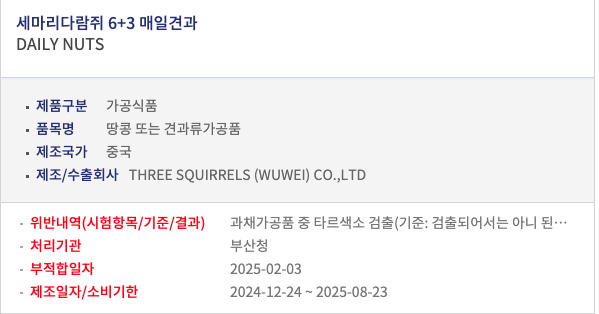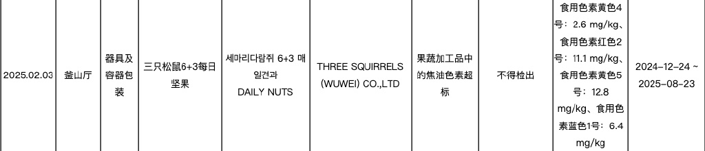根据韩国食品医药品安全部2025年2月3日消息,两批次来自中国的“三只松鼠6+3每日坚果”因违反当地食品安全要求,被做退回中国或废弃处理。