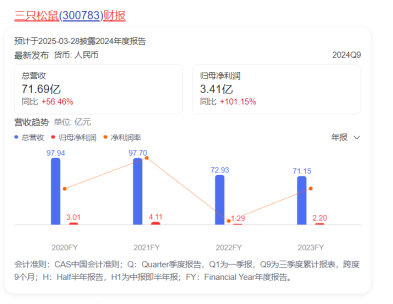 值得关注的是,2024年,三只松鼠的业绩表现亮眼。三只松鼠2024年财报预告显示,三只松鼠预计2024年全年公司实现营业收入102亿元-108亿元,同比增长43.37%-51.80%;净利润4亿元-4.2亿元,同比增长81.99%-91.09%。其中,第四季度营收和净利增速低于全年。