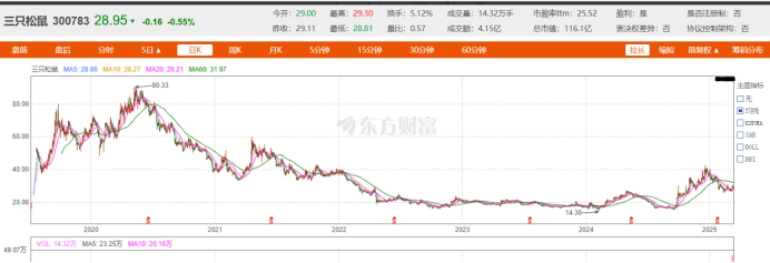 二级市场上,投资者对三只松鼠的态度亦反复不定,在去年年底出现上扬后,今年以来尽管有利好业绩支撑,股价却持续下跌。今日,三只松鼠涉酒消息发出后,其股价亦呈现向下趋势。或预示着三只松鼠的探索,在投资者看来存在不小的不确定性。时间线拉长,自上市以来,三只松鼠的股价已经跌去超六成。