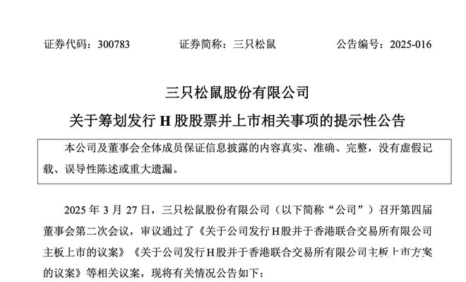 3月27日晚,三只松鼠(300783.SZ)发布公告称,为进一步落实“高端性价比”总战略,强化“制造、品牌、零售”前后一体化的全面布局,进一步促进公司全球品牌知名度提升及全球供应链体系建设,拓展境外融资能力,三只松鼠计划到港股上市。