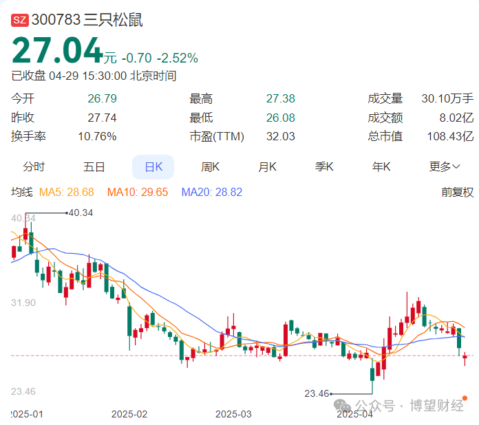 反映在资本市场上,三只松鼠市值缩水严重,2025年4月29日A股股价报收27.04元/股,市值为108.43亿元,年内累跌约20%,较巅峰时期缩水超250亿元。