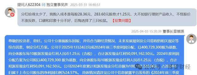 在2024年度业绩发布会上,有投资者提问表示,分红给得太少了,其购入成本是每股28.36元,283.60元股息才1.25元,大不如银行理财产品收入,难怪股价不涨反跌。
