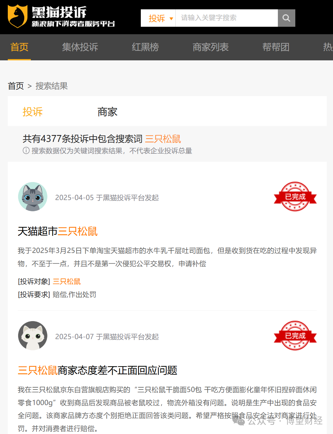 食品安全,代工模式下的信任危机。食品安全是休闲零食行业的生命线,但三只松鼠的代工模式使其成为投诉重灾区。据黑猫投诉平台显示,截至2025年4月28日,通过检索“三只松鼠”,累计投诉量达近4400条,涉及发霉、异物、添加剂超标等问题。其中有消费者称,“在抖音三只松鼠官方旗舰店花19.9买了一袋500g的芒果干,拆开食用发现中间有一根大约食指长的黑色头发丝。”无独有偶,还有消费者表示,“我于2025年3月25日下单淘宝天猫超市的水牛乳千层吐司面包,但是收到货在吃的过程中发现异物”。