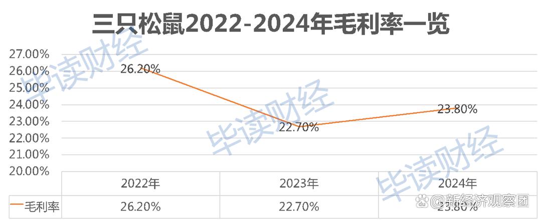 直到2024年三只松鼠才终于重回百亿营收俱乐部,全年营收达到106.22亿元,同比增长49.30%,归母净利润为4.08亿元,同比增长85.51%。虽然业绩有所回暖,但随着电商平台流量红利的逐渐消退以及竞争对手的加剧,三只松鼠不得不面对日益严峻的市场竞争环境。2022年-2024年,三只松鼠经营的整体毛利率分别达到26.2%、22.7%、23.8%,波动十分明显。