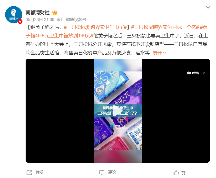 实际上,量贩零食仅是三只松鼠多元化战略版图中的一个细分方向。酒业、乳业、宠物食品、卫生巾……三只松鼠的目标,是成为全品类自有品牌零售商。