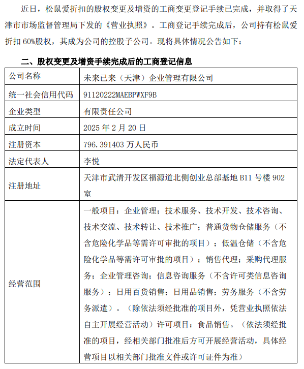 今年5月,三只松鼠宣布,爱折扣的股权变更及增资的工商变更登记手续已完成,并取得了天津市市场监督管理局下发的《营业执照》。工商登记手续完成后,公司持有爱折扣 60%股权,其成为公司的控股子公司。