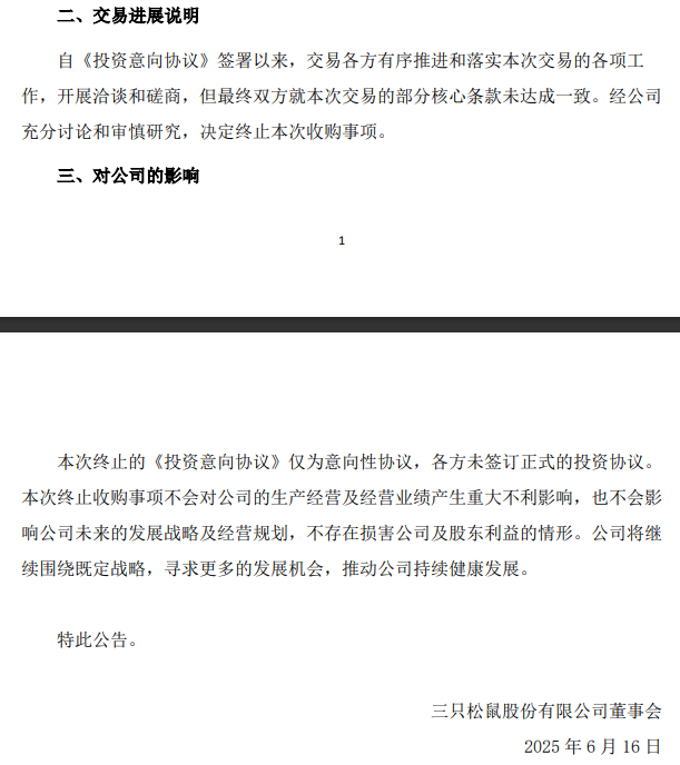 三只松鼠在公告中补充道:“本次终止的《投资意向协议》仅为意向性协议,各方未签订正式的投资协议。本次终止收购事项不会对公司的生产经营及经营业绩产生重大不利影响,也不会影响公司未来的发展战略及经营规划,不存在损害公司及股东利益的情形。”